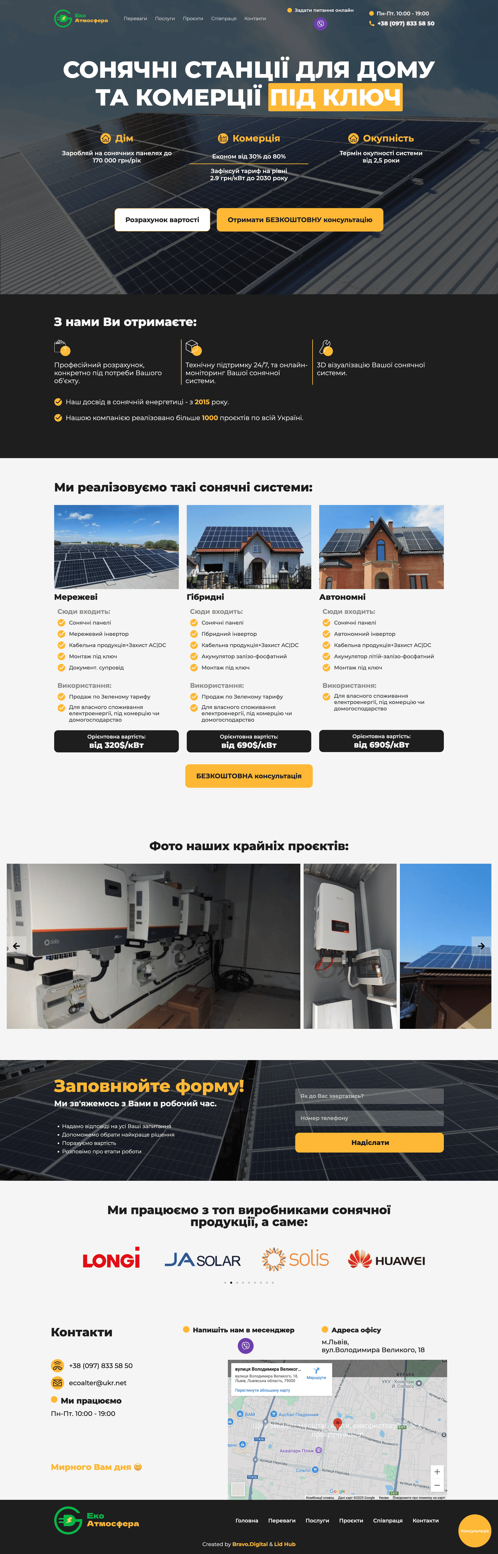 Сайт для компанії, що встановлює сонячні станції під ключ для дому та бізнесу з акцентом на вигоду і швидку окупність.